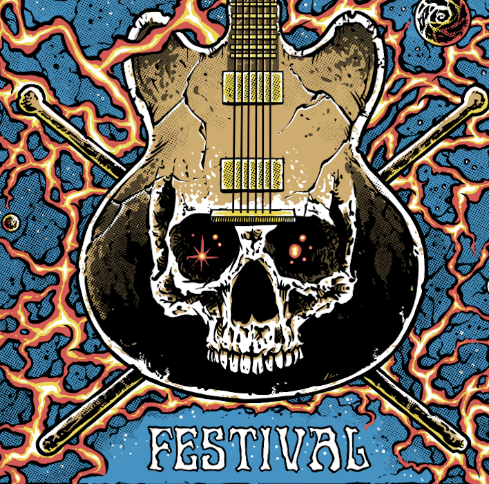 Das im unverwechselbaren Stil von Dr. Knoche gehaltene Plakat ist eine kraftvolle Komposition, die sofort ins Auge springt. Das zentrale Element bildet eine markante Gitarre in „Skull-Optik“, die von leuchtenden, organischen Strukturen durchzogen und von schwebenden Planeten umgeben ist. Darüber schwebt als visueller Gegenpol eine Schallplatte, die das zweite zentrale Element des Festivals symbolisiert. Die dunkle Farbpalette, akzentuiert mit leuchtenden Orangerot-Töne, schafft eine Atmosphäre von Energie, Leidenschaft und unkonventioneller Kreativität, die perfekt die Stimmung des Vinyl & Music Festivals abbildet.